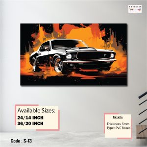 Ignite your walls with the raw power of an American icon. This striking artwork features a classic Ford Mustang silhouette emerging from a bold, fiery orange and black abstract backdrop. With its high-contrast design and aggressive styling, this piece is a must-have for car enthusiasts, collectors, or anyone looking to add a powerful focal point to their garage, office, or studio.