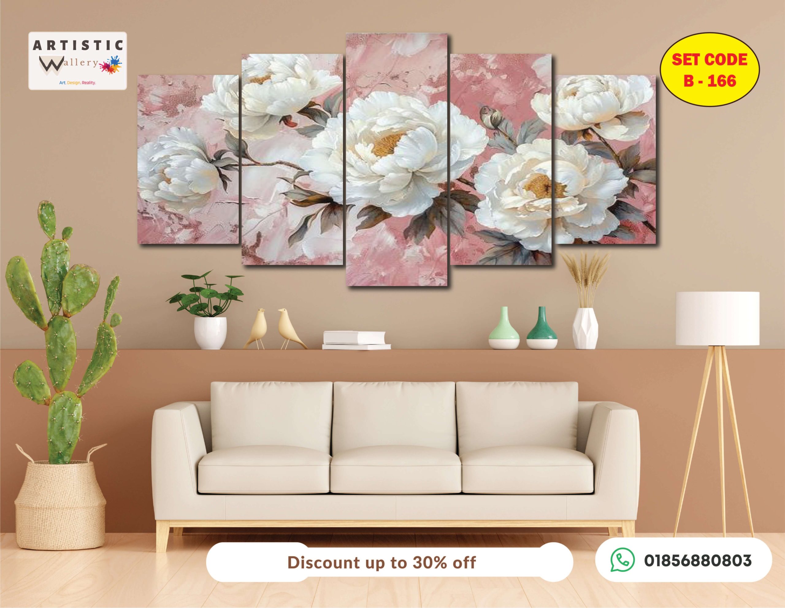 Infuse your home with classical elegance and a touch of nature with the Artistic Wallery Vintage Peony 5-Panel Set. This artwork (Set Code: B-159) features lush white peonies in full bloom, accented by a delicate blue butterfly and shimmering gold-textured details against a rich teal backdrop. It’s the perfect choice for creating a sophisticated, high-end look in your living room, dining area, or master suite.