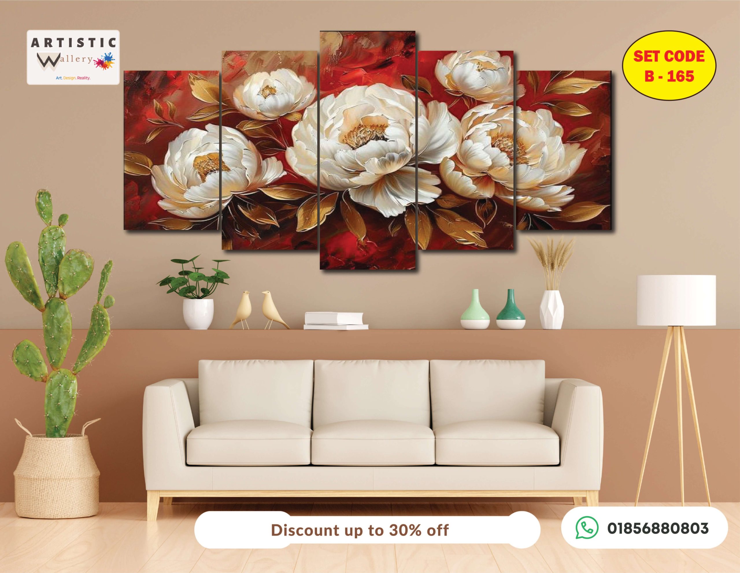 Bring a touch of bold, classical luxury to your home with the Artistic Wallery Royal Crimson Peony 5-Panel Set. This masterpiece (Set Code: B-165) features large, luminous white peonies set against a dramatic ruby-red and mahogany background, accented with elegant golden-brown leaves. It is a perfect choice for those who want to create a high-impact, sophisticated focal point in their living room, dining area, or master suite.