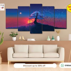 Bring a dreamy sunset vibe into your living space with this beautiful Sunset Tree 5-Panel Wall Art Set. Designed with vibrant sunset colors and a stunning silhouette tree, this artwork creates a calm and modern atmosphere in any room. The multi-panel design adds depth and style, making it a perfect centerpiece for your living room, bedroom, office, or hallway.