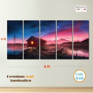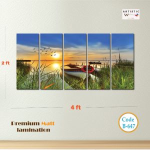 Escape to the water every day with the "Peaceful Waters" 5-panel split art set. This stunning landscape (Code B-647) features a calm lake at sunset, a rustic rowing boat, and a flock of birds drifting across a golden sky. Its bright, natural tones are perfect for opening up a space and adding a refreshing, airy feel to your living room or office.