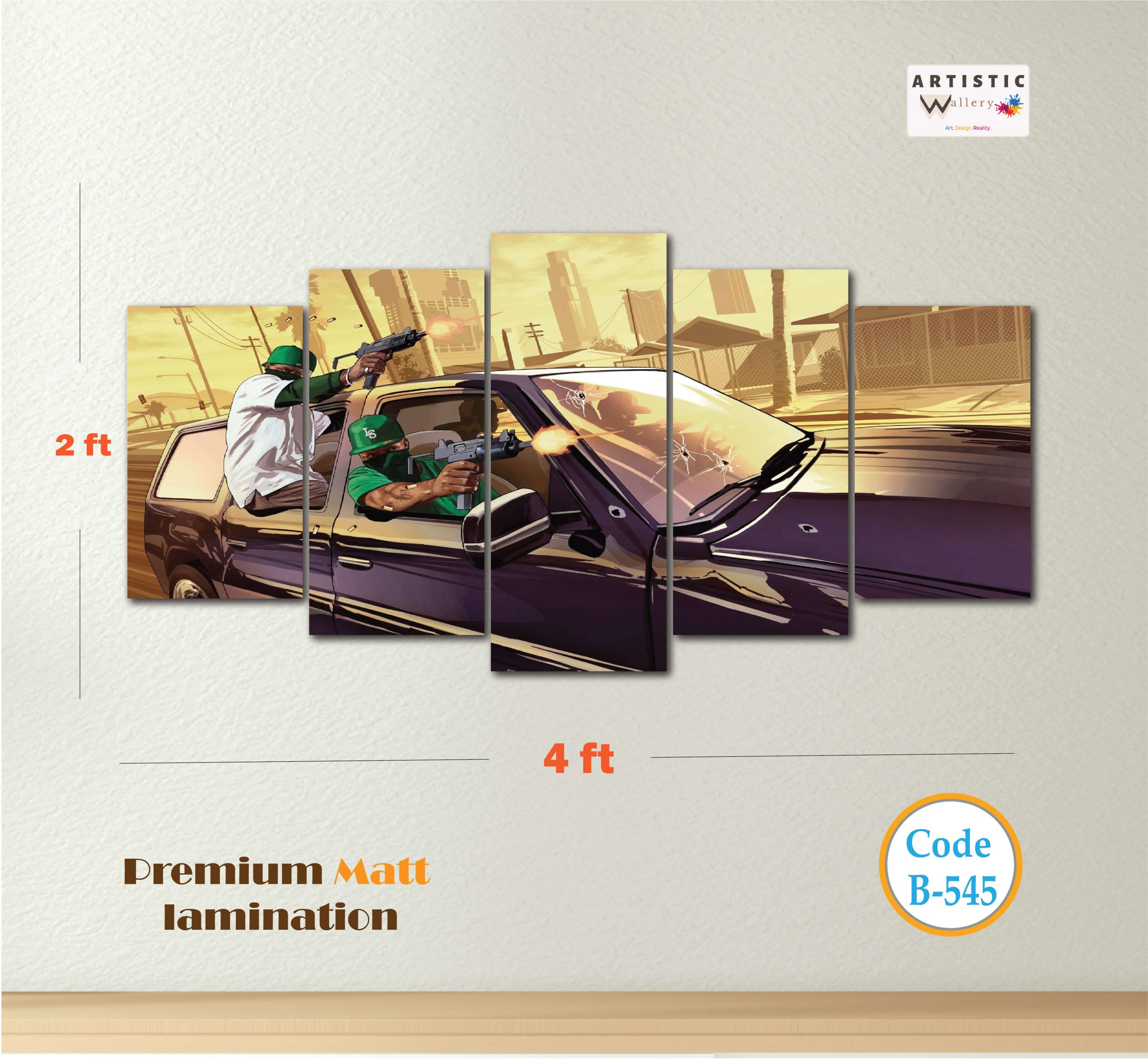 Throw it back to the golden era of open-world gaming with this action-packed 5-panel Urban Drive-By wall art. Featuring the iconic green-clad crew in a high-stakes chase through the sun-drenched streets of Los Santos, this piece (Code: B-545) captures the raw energy and cinematic grit of the world’s most famous street-life simulator.