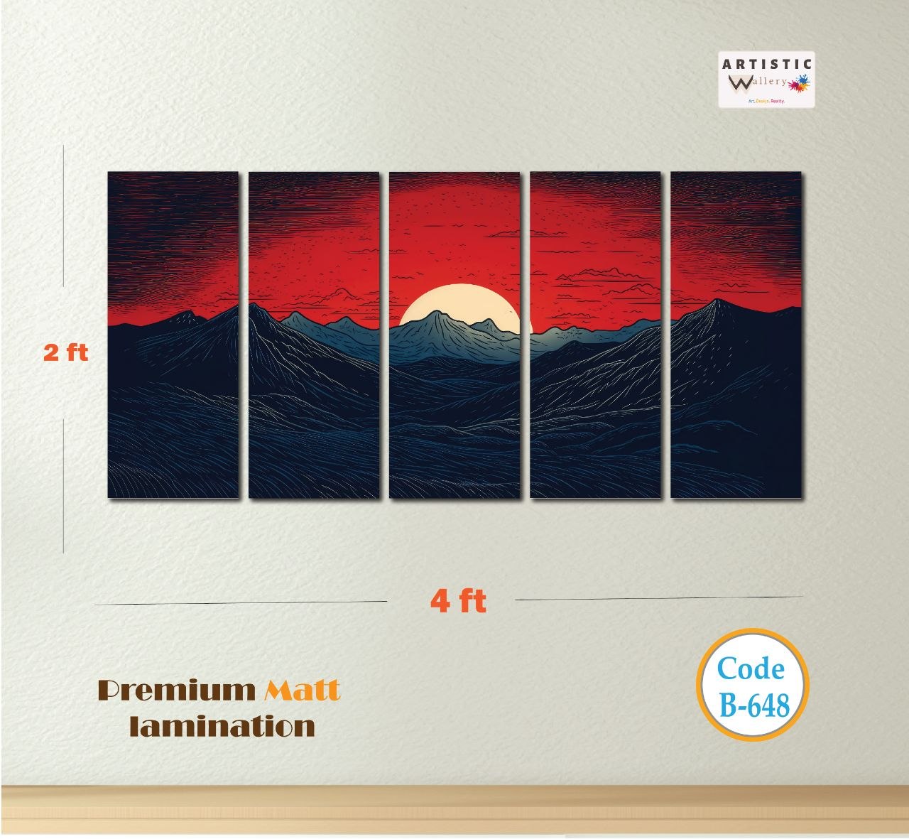 Infuse your space with dramatic energy with the “Crimson Horizon” 5-panel split art set. This unique piece (Code B-648) features a bold, illustrative style with sharp lines and high-contrast colors. The deep navy mountains set against a fiery red sky create a powerful visual impact that works perfectly in gaming rooms, creative studios, or modern living areas