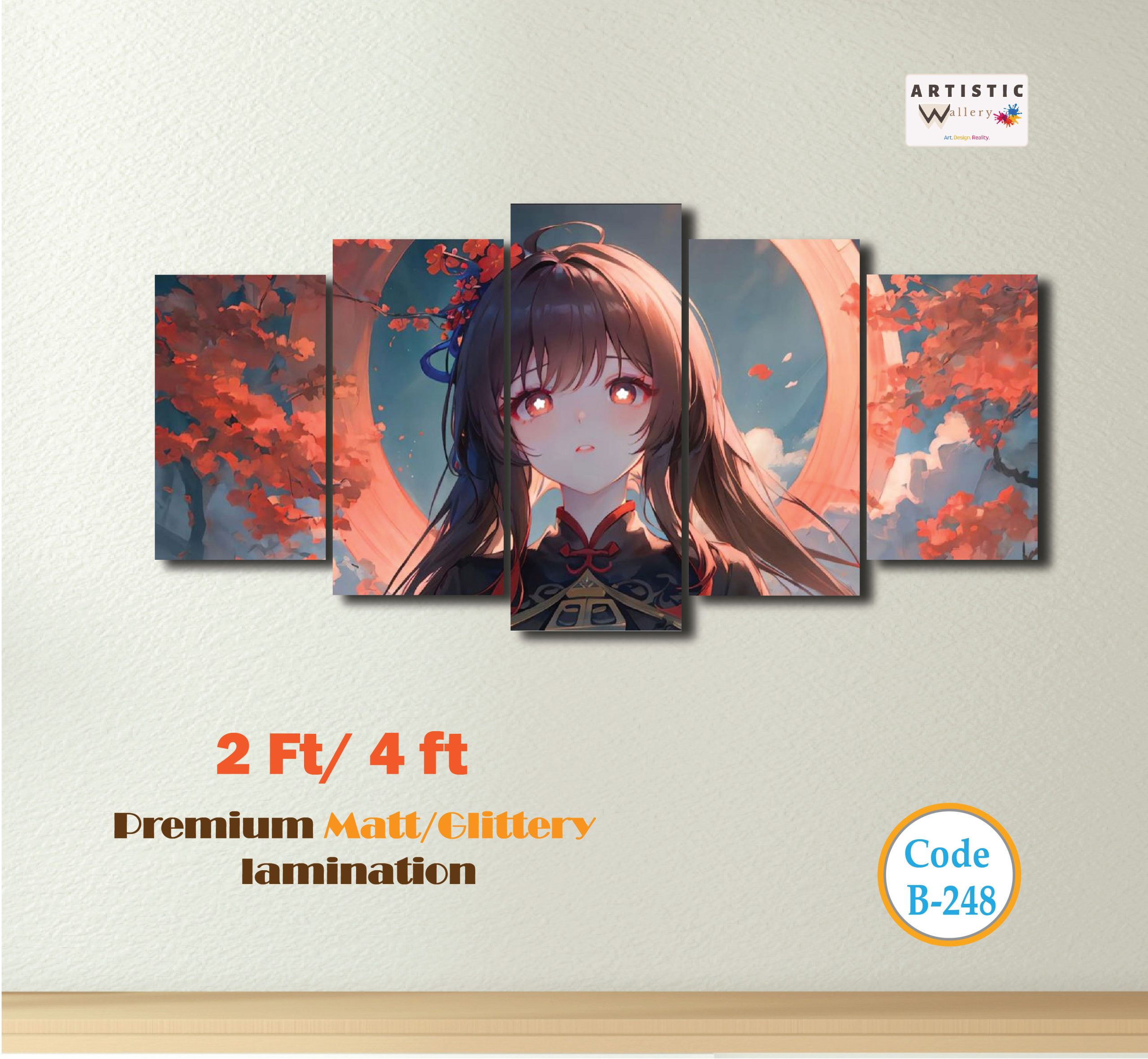 Ignite your space with the playful yet mystical energy of Hu Tao from Genshin Impact. This stunning 5-panel wall art set captures the 77th Director of the Wangsheng Funeral Parlor amidst a beautiful backdrop of swirling autumn leaves and a glowing twilight sky. With her signature plum blossom eyes and vibrant aesthetic, this piece is a must-have for any Traveler looking to upgrade their gaming setup or bedroom decor.