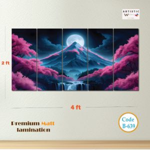 Bring calm, beauty, and elegance to your space with this stunning 5-panel landscape wall frame featuring a majestic mountain under a glowing full moon, surrounded by vibrant cherry blossom trees. The rich contrast of deep night blues and soft pink sakura creates a peaceful yet visually captivating scene that instantly enhances any room.