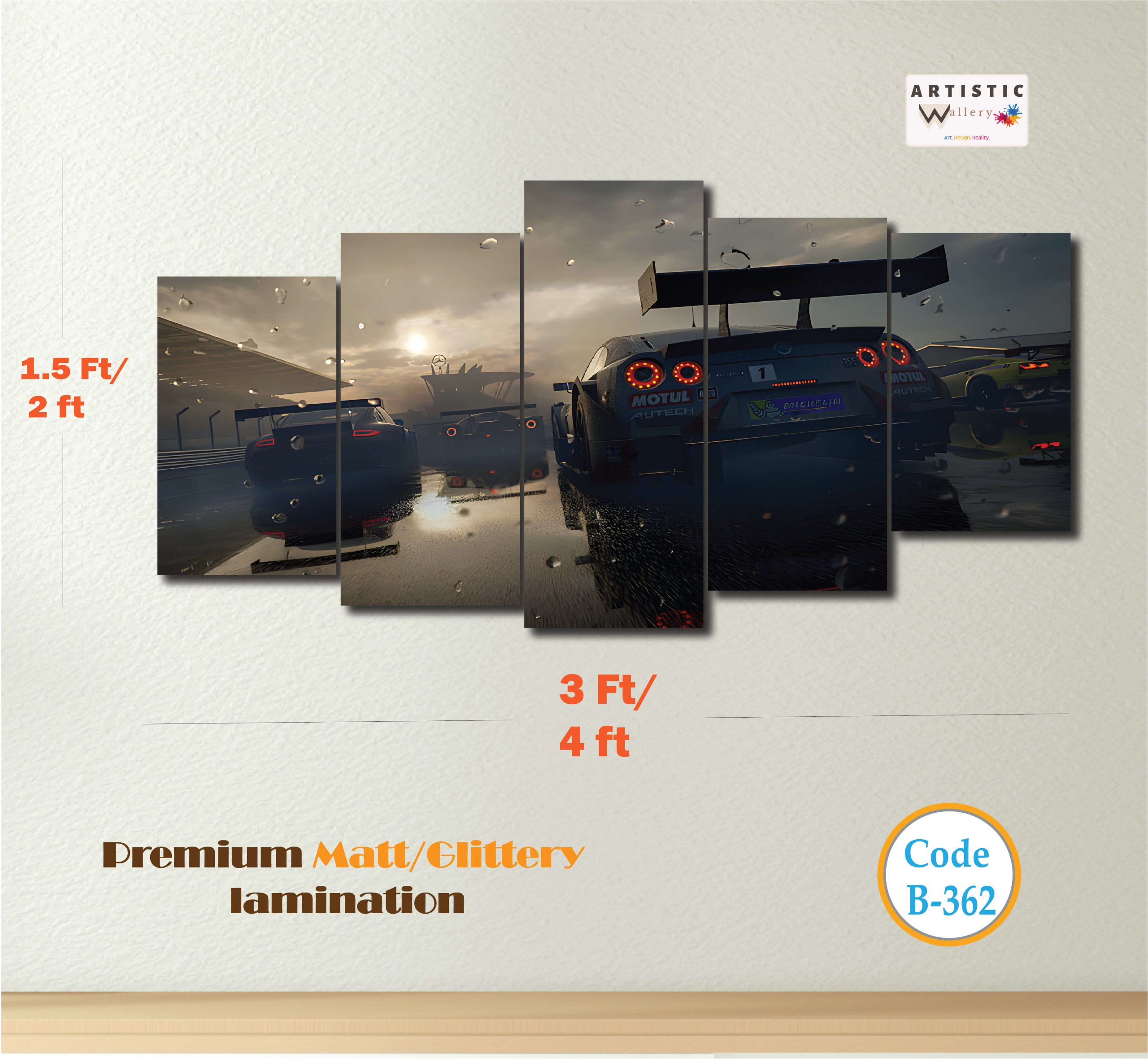 Feel the adrenaline of the track with this immersive 5-panel Pro Racing wall art. Featuring high-performance GT cars under a dramatic, overcast sky, this piece (Code: B-362) perfectly captures the intensity of competitive racing. The reflection of the sunset and brake lights on the wet asphalt adds a layer of realism and depth that will transform any room into a high-octane sanctuary.