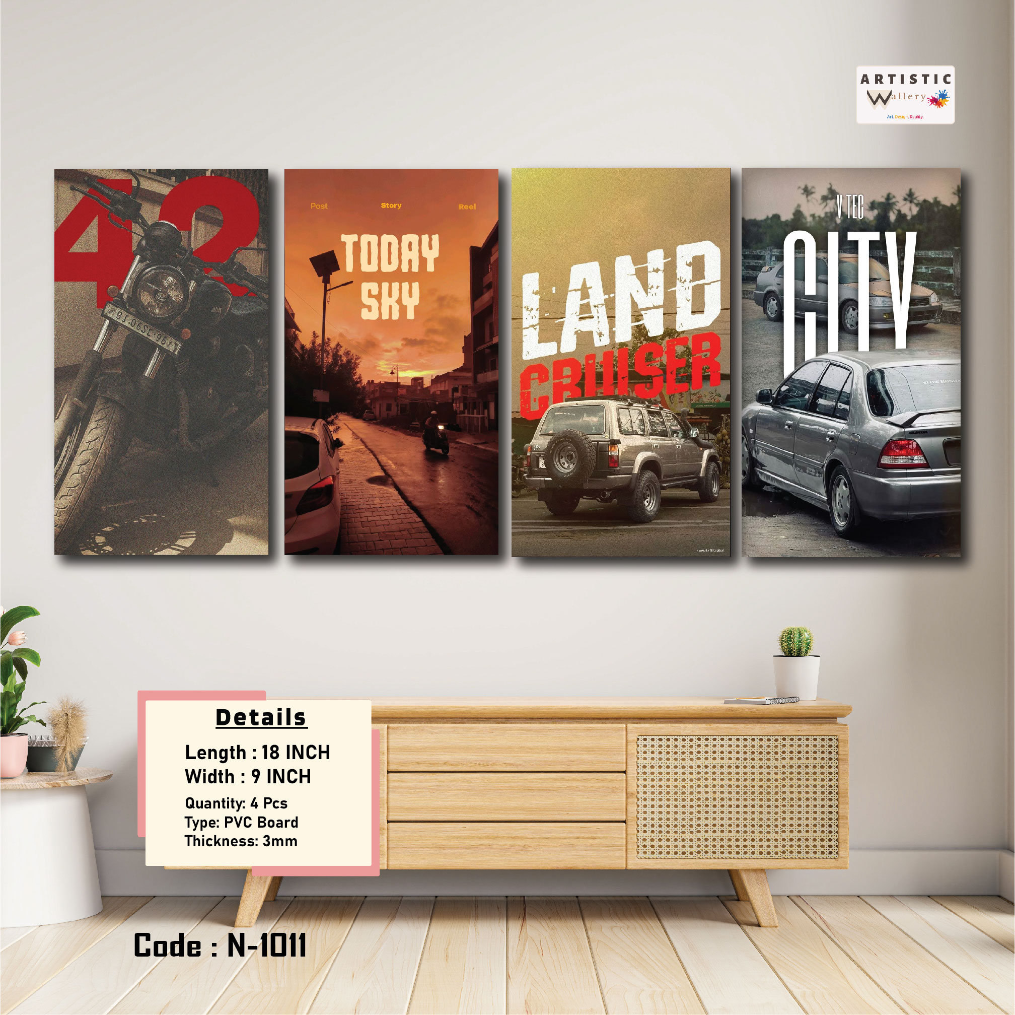 Featuring artistic visuals like a powerful bike, city sunset streets, classic off-road vehicles, and performance sedans, this wall art set captures the energy of urban driving culture and adventure. The warm tones and cinematic compositions bring a unique aesthetic that stands out in any room.